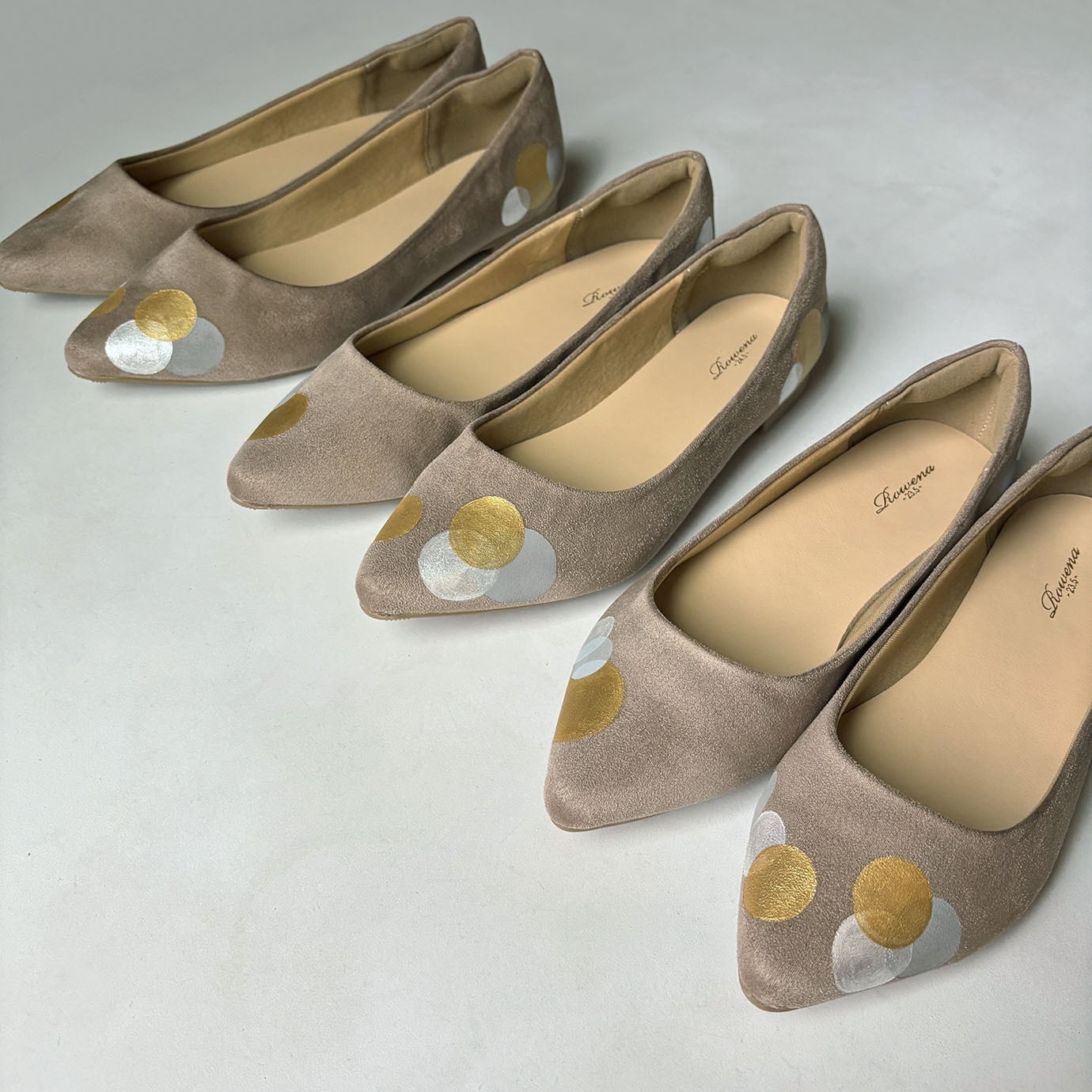 ************************************************************* アウトレット価格! 5980円×→3980円(2000円割引) ************************************************************* 大人可愛いシリーズ パンプス! 《祝》累計 販売数1000足突破!! ************************************************************* 【 サイズ(2E) 】23.5 / 24.5 /26.0 【 アウトレット品 】 こちらはサイズ限定のアウトレット品です。 多少の汚れ、傷等がございますため、 通常よりもお得な価格になっております。 ご理解の上、ご購入をお願い致します。 【 大人可愛いシリーズ 】 こんなデザインあったらいいなぁ〜 シンプルで大人っぽいけど、でも可愛い! 新しく始めた「大人可愛いシリーズ」になります。 【 デザインについて 】 人気デザインの新色!グレーベージュ(生地色)に、 アンティークゴールド×パールホワイト×グレーの水玉柄を加えて、 大人っぽく、そして可愛いデザインに仕上げました! 【 サイズ感について 】 ふかふかのクッションインソールなので、足への負担を軽減! また、かかとクッションにより脱げづらくぴったりフィット! ・スタッフが試着してみました。 普段のスニーカーサイズ:23.5〜24.0センチ 甲:普通 幅:普通 体型:普通 23.5センチ着用時:履くとキツイ。 24.0センチ着用時:素足OK。ストッキングを履いて問題なし。          靴ずれ防止が付いてるので脱げにくい。 ※足の形には個人差がございますので、参考程度にお考え下さい。 【 カラー 】 グレーベージュ(生地の色)×ゴールド×パールホワイト×グレー ※光の加減などで深い色に見えたり、明るい色に見えたりします。 【 生産国 】 ペイント作業:千葉県のアトリエで制作 スニーカー本体:Made in China 【 素材/本体 】 ソール(底)高さ/約1.5cm 重さ/23.5サイズで片足約160g 甲材:合成繊維(スエード調) 底材:合成ゴム 【 注意点 】 ▼塗料/ラメについて 塗料、ラメ共に水に落ちないように加工しています。 ただ雨、水等に濡れてしまった場合は、完全に乾いてから履いてください。 乾かないうちに履いてしまうと、塗料が柔らかくなっているため、 剥がれる可能性がございます。雨の日は避けてください。