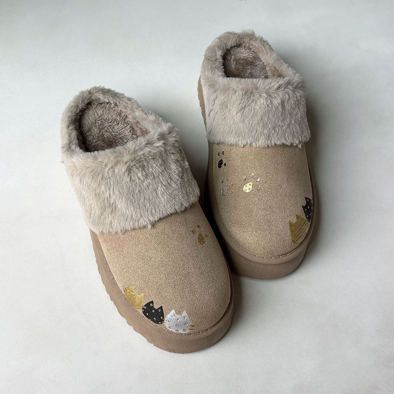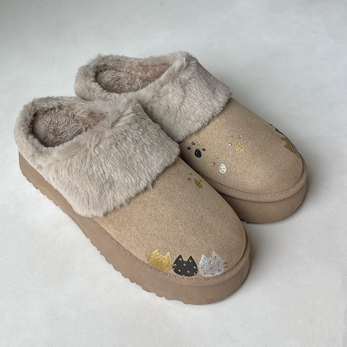 「サッと履けるあったか厚底ボアサンダル」猫柄デザイン*サボサンダル*モカ レディース 秋冬シューズ!【受注製作】