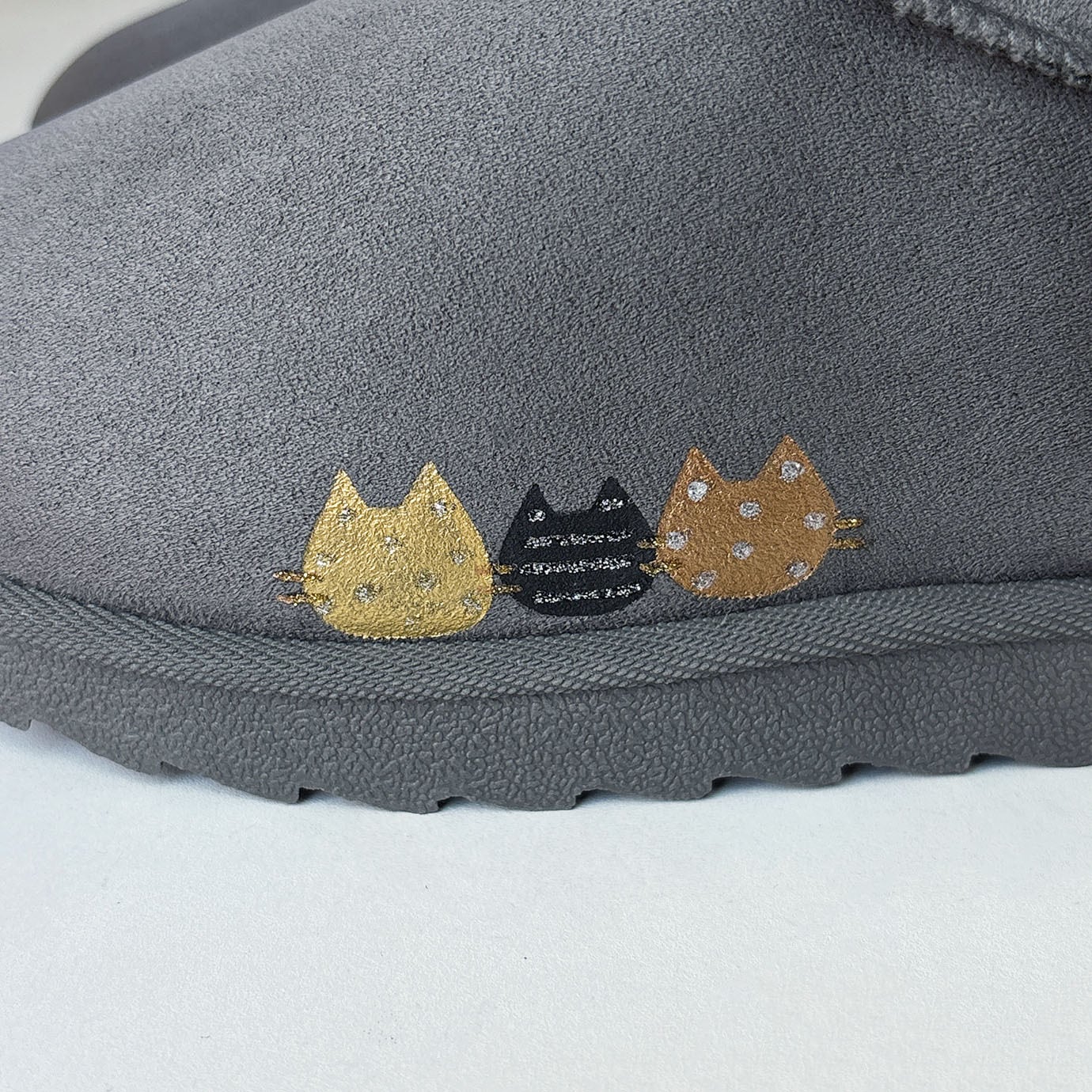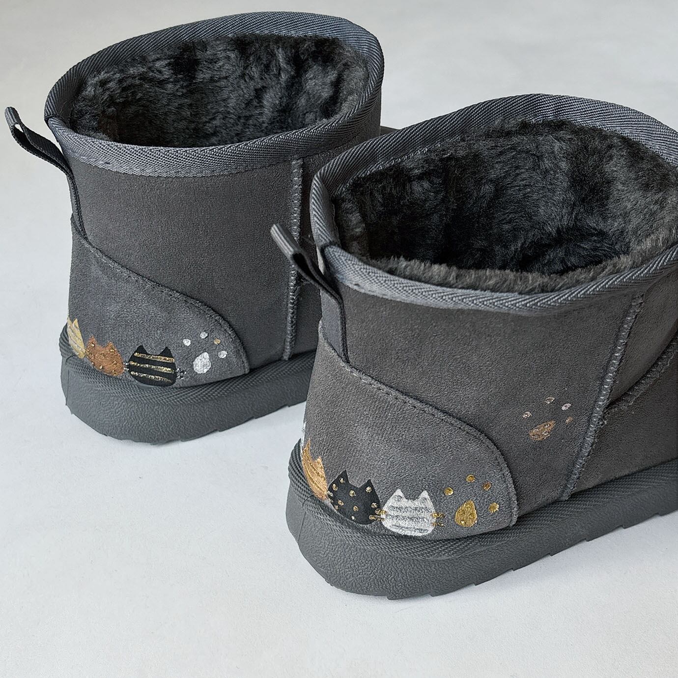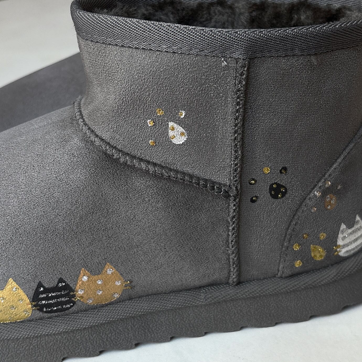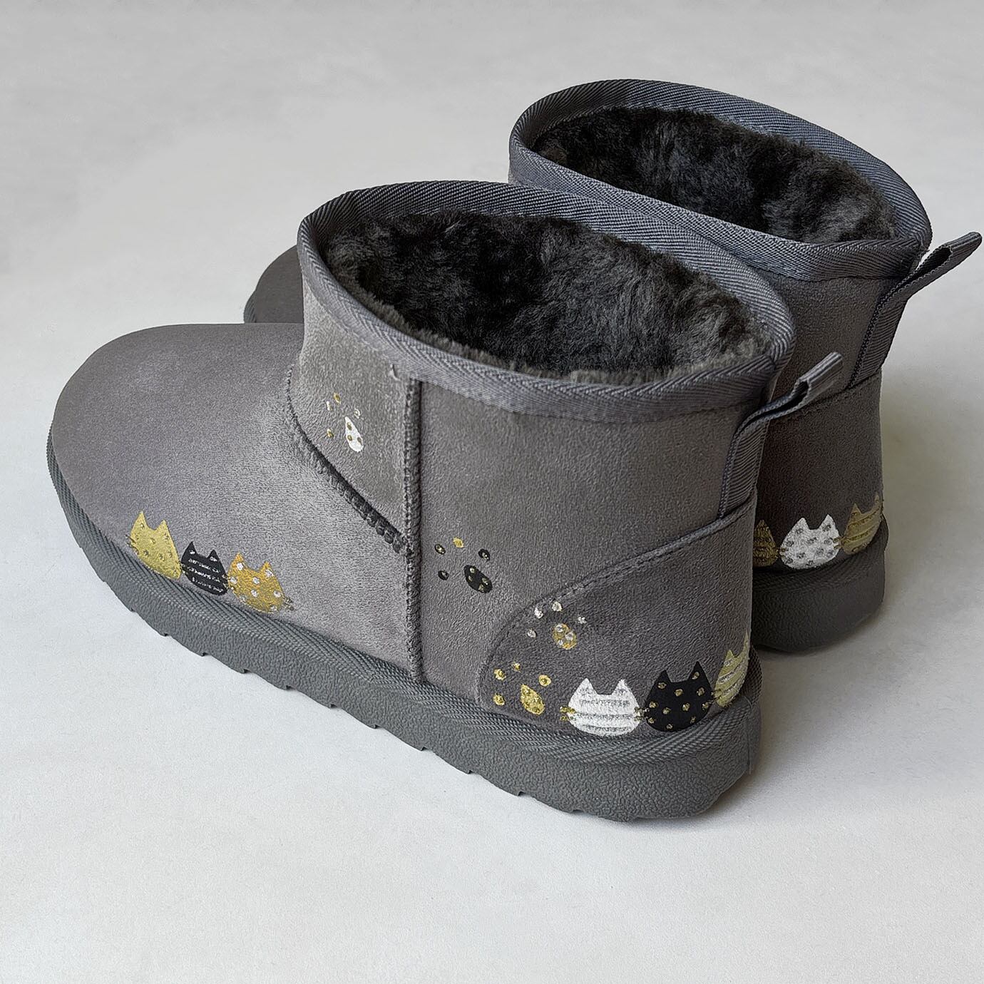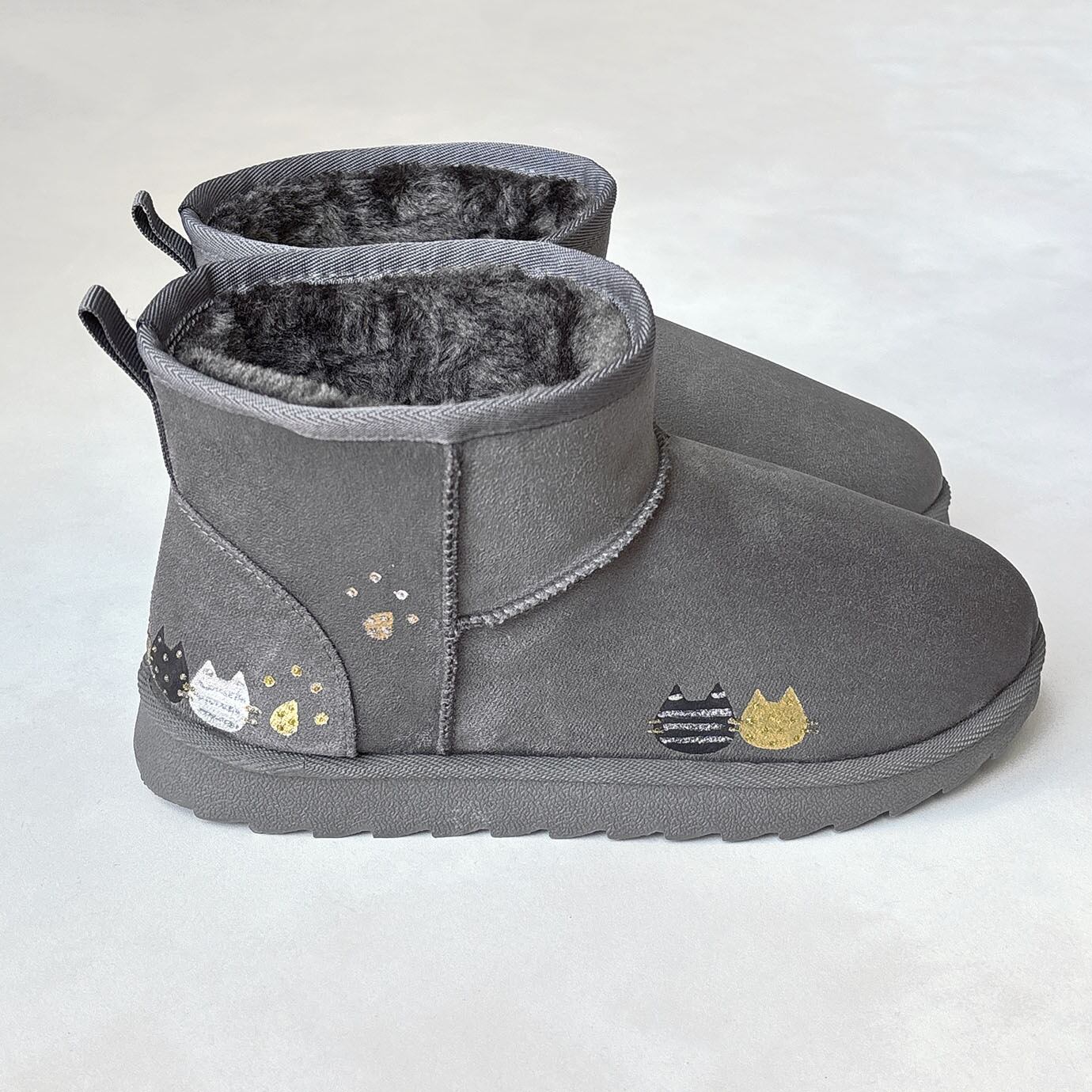 あったかボアのショート丈ねこ柄ブーツ✳︎ダークグレー!見え方を意識したユニーク猫柄ブーツ 【受注】【2025年モデル】