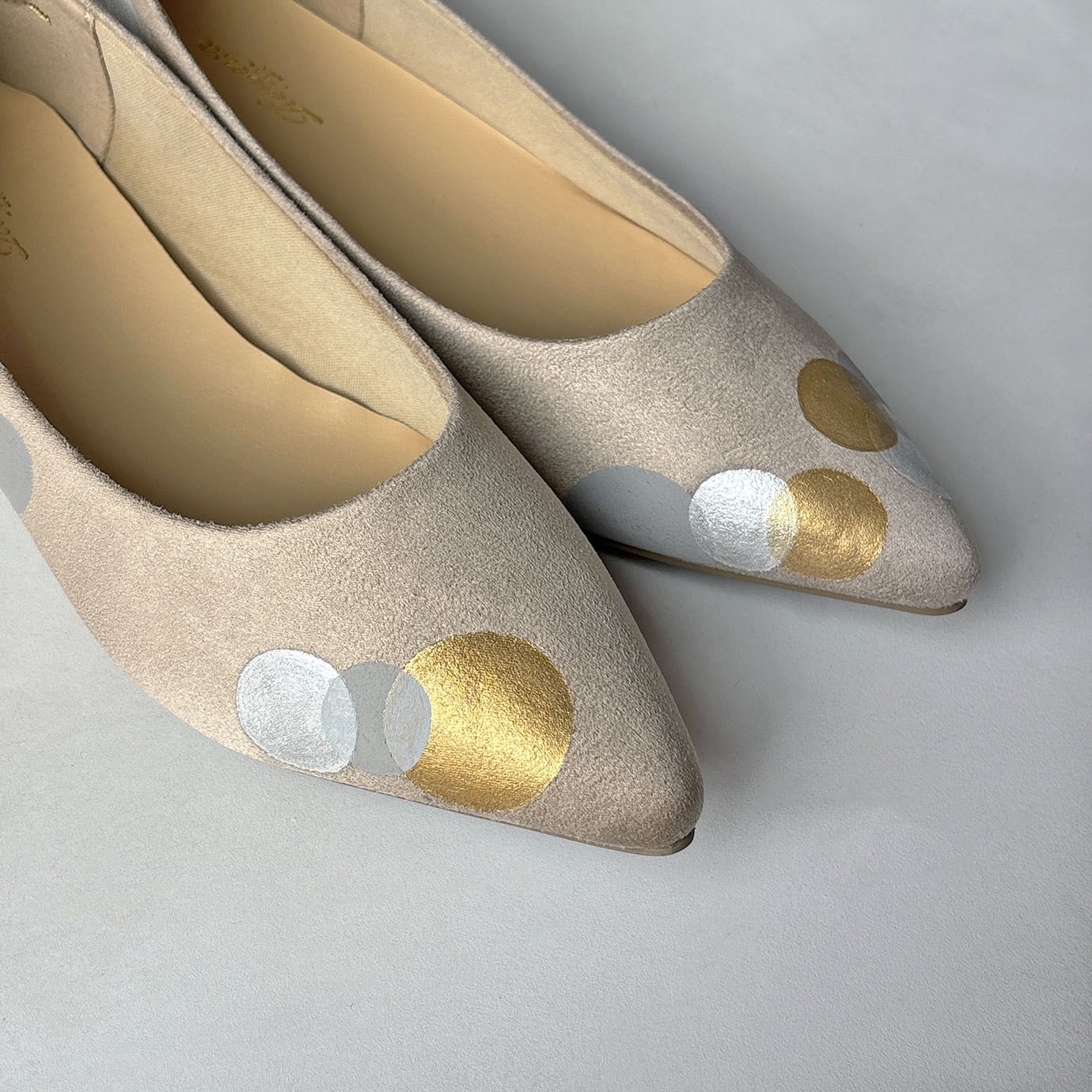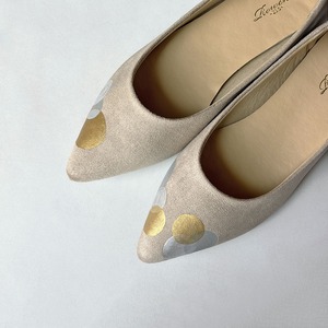 パンプス「ポインテッドトゥ Puddle」ベージュ*大人のローヒール!水玉柄 2E【21.5-26cm】【受注制作】